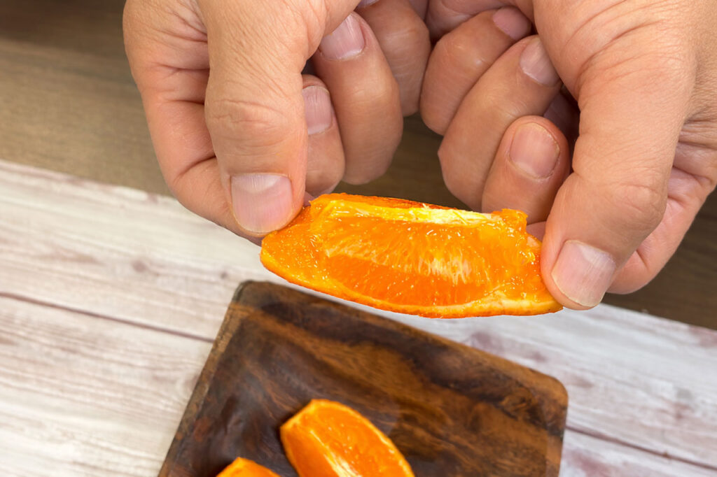 スマイルカットとは、柑橘をくし形に切ったあと皮の一部を切り落として“笑った口”のような形にする切り方です。